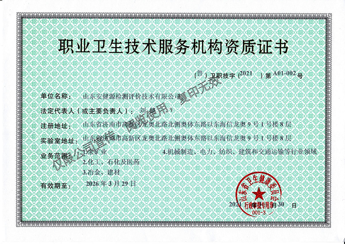 2021年3月30日,山东安健源检测评价技术有限公司领取了由中国(山东)自由贸 易试验区济南片区综合服务中心(济南高新区政务服务中心)颁发的职业卫生技术服务 机构乙级资质证书,顺利完成了该项资质的延续换证工作,是中国(山东)自由贸易试 验区承接这一省级权力事项以来全省首批获得该资质许可的机构。